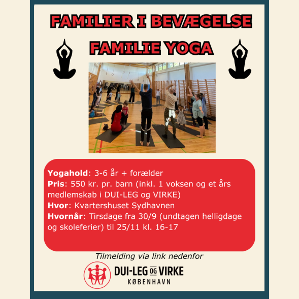 Familier i Bevægelse arrangeres af DUI-LEG og VIRKE København, med støtte fra Trygfonden, og er en medlemsaktivitet. Derfor er din betaling ikke et deltagergebyr, men et medlemskontingent. Det betyder, at man som deltager på et Familier i bevægelseshold også har mulighed for at tilmelde sig andre sjove aktiviteter, som arrangeres af DUI-LEG og VIRKE København. Herunder Børnedisko, Halloween, Sankt Hans og Ferielejr.